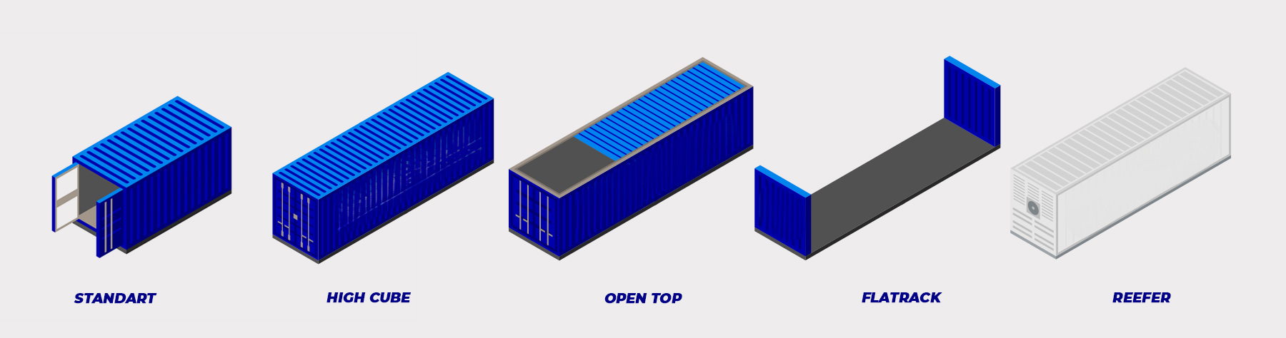 High Cube Konteynerler: (HC) Bu tarz konteynerler standart konteynerlerle yapısal olarak benzerlik taşımakla beraber yüksekliği 2591mm olan box konteynerlerden 2896mm yüksekliği ile iç hacmi daha fazla yüklemeye olanak sunan bir konteyner tipidir. Genellikle 40′ olarak üretilmiştir. Kullanım alanları her çeşit kuru yük, hafif ve hacimli yükler ve yüksekliği 2,7m’ye kadar olan gabari yüklerin taşınmasında kullanılır.